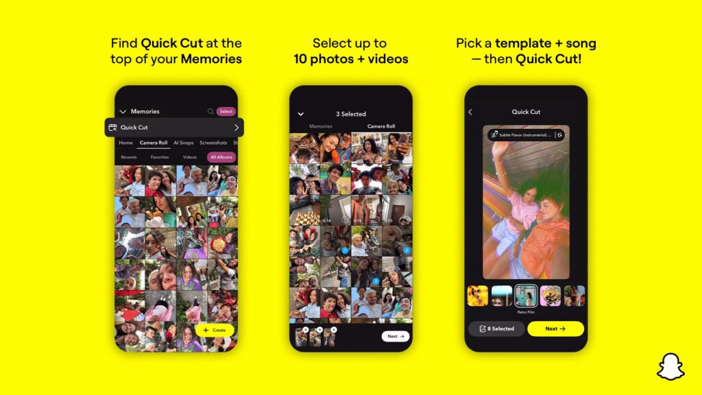The process can start directly through people’s Camera Roll or in Memories on the Snapchat app, and users can add their own media to a Quick Cut from another user.